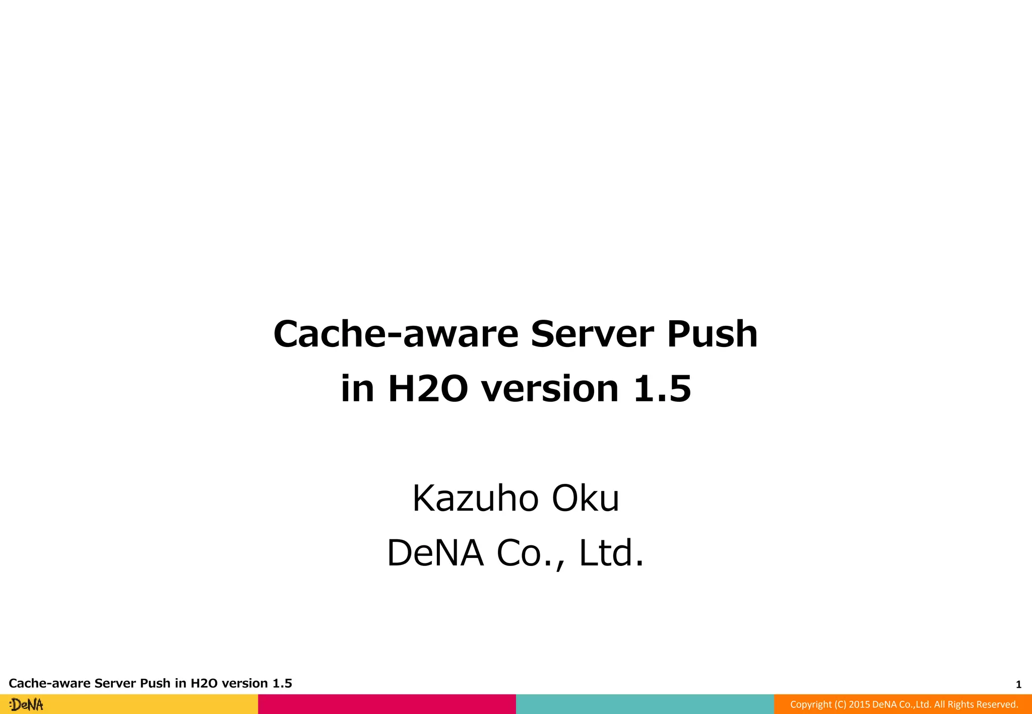 This document discusses cache-aware server push in H2O version 1.5. It describes calculating a fingerprint of cached assets using a Golomb compressed set to identify what assets need to be pushed from the server. It also discusses implementing this fingerprint using a cookie or service worker. The hybrid approach stores responses in the service worker cache and updates the cookie fingerprint. H2O 1.5 implements cookie-based fingerprints to cancel push indications for cached assets, potentially improving page load speeds.