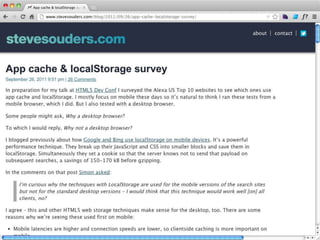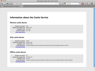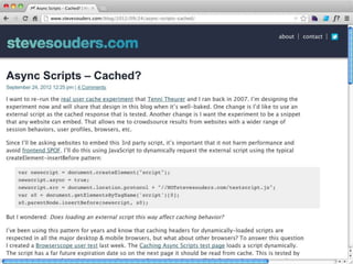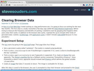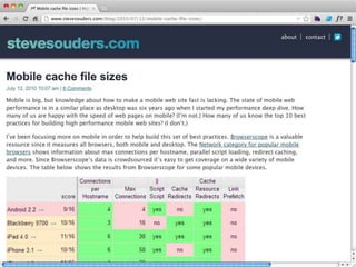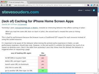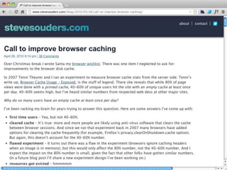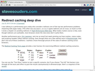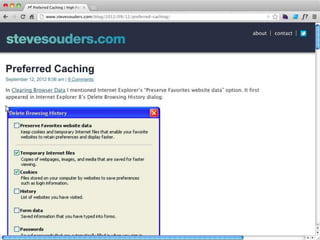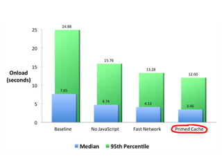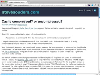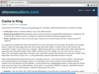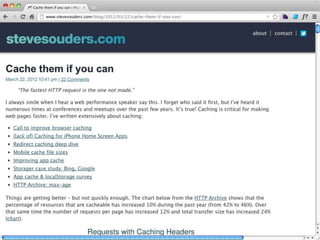 Cache is King discusses the importance of caching for website performance. It shows that enabling caching through techniques like setting Cache-Control headers can reduce page load times significantly. Specifically, using max-age to set expiration times for cacheable assets avoids unnecessary HTTP requests. For dynamic content, no-cache must be used to prevent caching. The document advocates being explicit with caching directives and measuring caching behavior to identify opportunities to optimize websites for cached access.