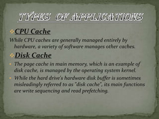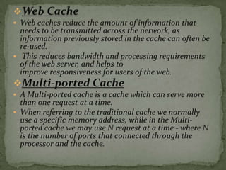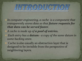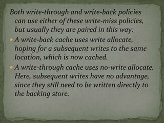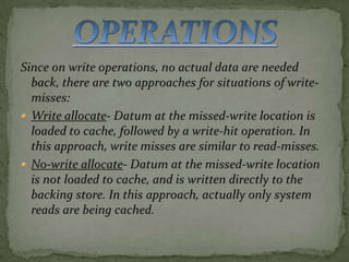 Each entry in a CPU cache contains a tag specifying the datum in backing storage that the entry copies. When accessing data, the cache is checked first, and if a matching tag is found, the cached datum is used instead of retrieving from storage. The percentage of accesses served from the cache is known as the hit rate. There are two write policies - write-through writes synchronously to both cache and storage, while write-back only writes to cache initially before writing back to storage when replacing cache blocks.
