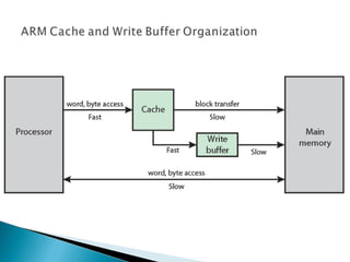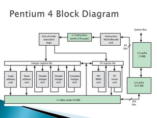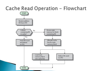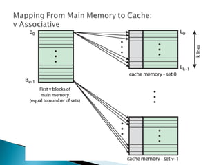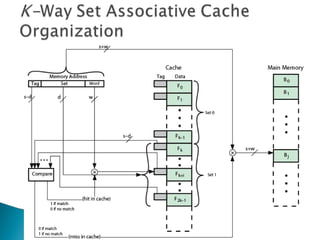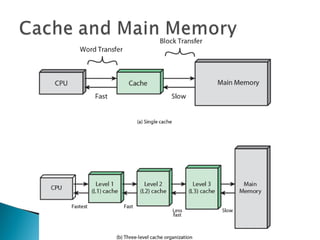 The document discusses cache design and organization. It describes how caches work, sitting between the CPU and main memory to provide fast access to frequently used data. The key aspects covered include cache size, block size, mapping techniques, replacement algorithms, write policies, and the evolution of cache hierarchies in processors like the Pentium IV with multiple levels of on-chip and off-chip caches.