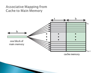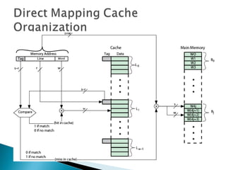 The document discusses cache design and organization. It describes how caches work, sitting between the CPU and main memory to provide fast access to frequently used data. The key aspects covered include cache size, block size, mapping techniques, replacement algorithms, write policies, and the evolution of cache hierarchies in processors like the Pentium IV with multiple levels of on-chip and off-chip caches.