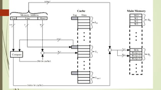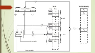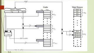 Cache memory is a small, fast memory located close to the CPU that stores frequently accessed instructions and data. It aims to bridge the gap between the fast CPU and slower main memory. Cache memory is organized into blocks that each contain a tag field identifying the memory address, a data field containing the cached data, and status bits. There are different mapping techniques like direct mapping, associative mapping, and set associative mapping to determine how blocks are stored in cache. When cache is full, replacement algorithms like LRU, FIFO, LFU, and random are used to determine which existing block to replace with the new block.