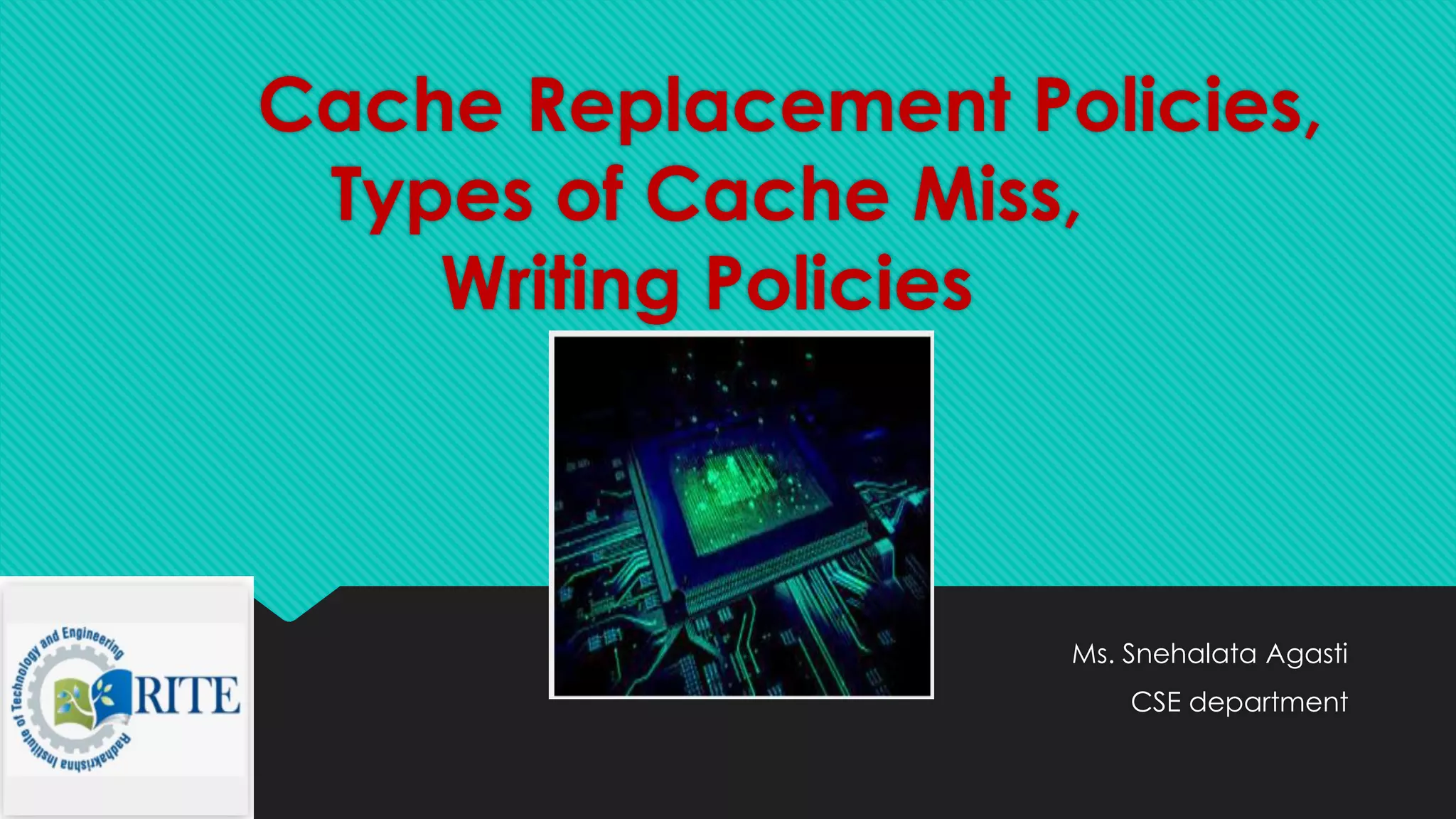 The document discusses cache memory management, focusing on replacement policies like FIFO, optimal, LRU, and MRU, detailing their operational mechanisms and associated hit and miss ratios. It also explains the types of cache misses (compulsory, capacity, and conflict) and writing policies (write-through and write-back) along with their implications on data consistency. Additionally, the document touches on the importance of cache coherence in multi-processor systems.