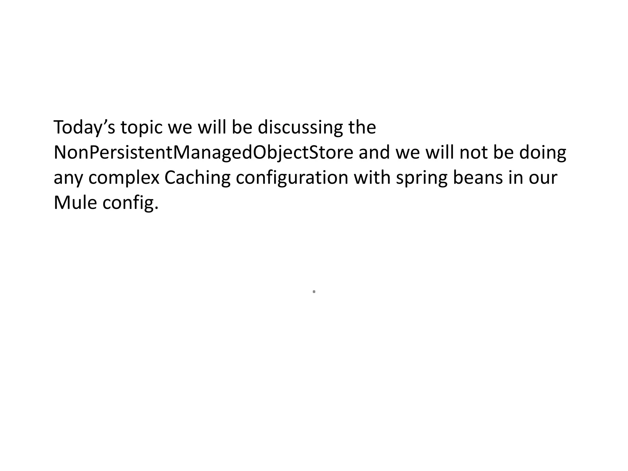 This document discusses how to use caching with the NonPersistentManagedObjectStore in Mule and invalidate the cache. It shows how to configure caching in a flow using the NonPersistentManagedObjectStore, test the cached response by deleting data from the database, and create a flow to invalidate the cache. When the cache is invalidated and the service is called again, it will retrieve new data from the database rather than serving the cached response.