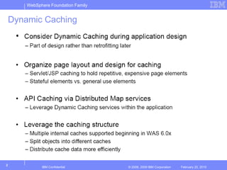 The document provides an overview of WebSphere Dynamic Caching on z/OS, detailing its core caching infrastructure, features, and monitoring capabilities. It explains the policies for cache configuration and emphasizes the performance, cost reduction, and high availability benefits of using Dynamic Cache. Additionally, it highlights the new features in version 7, including the FRCA cache and its impact on request costs and CPU utilization.