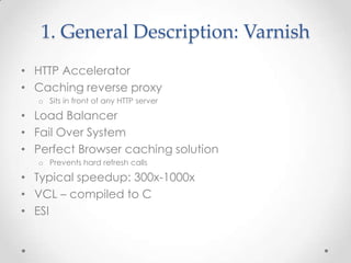 Varnish is an HTTP accelerator that acts as a caching reverse proxy, load balancer, and failover system. It sits in front of web servers to cache content and improve page load speeds by up to 1000x. Varnish uses Varnish Configuration Language (VCL) scripts to control caching, load balancing, and other behaviors. It supports Edge Side Includes (ESI) to cache page fragments with different expiration times. Popular sites using Varnish include Facebook, Twitter, and BBC.