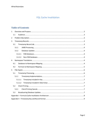 This document describes Facebook's approach to invalidating cached data from FQL formulas. It discusses how timestamp records track data updates across databases and namespaces. These timestamps are used to prime the cache and ensure clients receive the latest data. The FQL engine retrieves timestamps from Memcached and uses them to determine if cached data is stale before serving client requests.