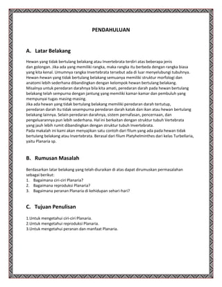Makalah ini membahas tentang cacing pipih Planaria sp. Planaria termasuk hewan invertebrata yang hidup di air tawar dan memiliki daya regenerasi yang tinggi. Planaria bersifat hermafrodit dan berkembangbiak secara seksual maupun aseksual melalui pembelahan tubuh.