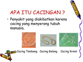 Cacingan adalah penyakit yang disebabkan oleh cacing yang menyerang tubuh manusia, dengan penyebab utama kebiasaan buruk dan makanan yang tercemar. Gejala cacingan meliputi perut buncit, badan kurus, lemas, dan sakit perut. Pencegahan melibatkan kebersihan pribadi dan lingkungan serta konsumsi obat cacing secara berkala.