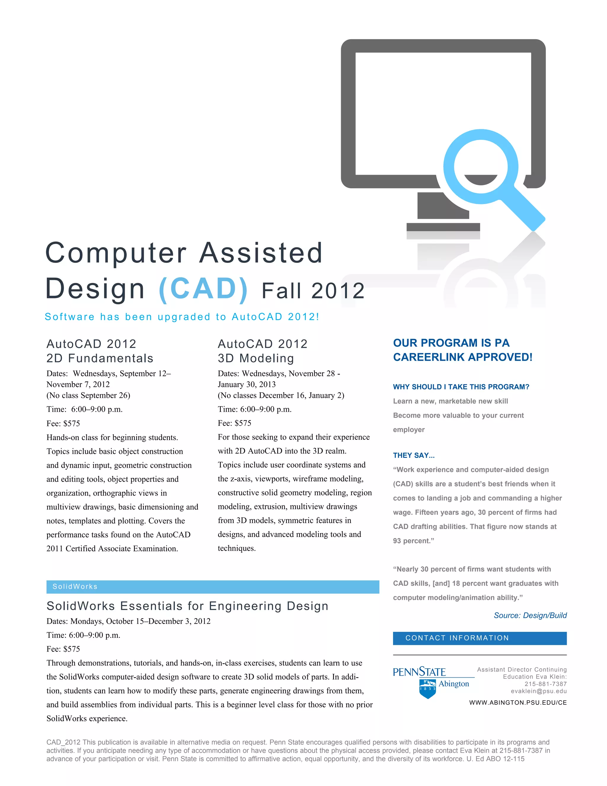 The document outlines a computer-aided design (CAD) program offered in Fall 2012, featuring courses in AutoCAD and SolidWorks for beginners aimed at enhancing marketable skills for employment. Classes run from September 12 to January 30, 2013, with fees of $575, and provide hands-on learning in 2D and 3D modeling. It highlights the growing demand for CAD skills in the job market and encourages participation, assuring accommodations for individuals with disabilities.