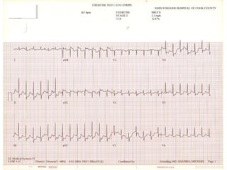 This document provides information about exercise electrocardiogram (ECG) stress testing for internists. It discusses the principles, purpose, procedures, patient preparation, understanding the report, contraindications, and indications for stress testing. The main points are: stress testing elicits cardiovascular abnormalities not seen at rest and determines cardiac function; it estimates prognosis and likelihood of coronary artery disease; procedures involve monitoring ECG and symptoms during treadmill exercise; the report details exercise duration, heart rate changes, symptoms, and any ECG abnormalities; contraindications include recent acute cardiac issues or inability to interpret ECG; and indications include diagnosing stable angina and risk stratifying unstable angina or recent heart attacks.