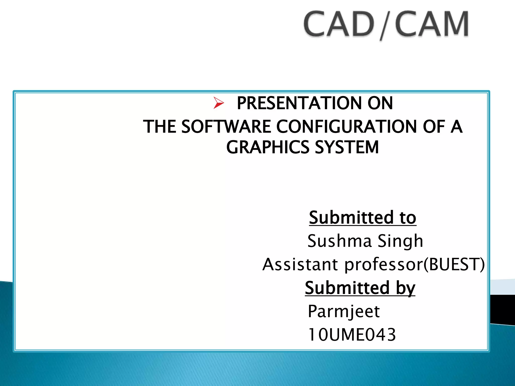 The document discusses the software configuration of a graphics system. It explains that graphics software includes programs for generating images on screen and interacting with the user. The software must be tailored to the specific hardware of the system, including the CRT and input devices used. When using a graphics system, a user can interact with the terminal to create and alter images, construct models on screen, and save models to memory or storage. The software configuration consists of a graphics package, application program, and application database.