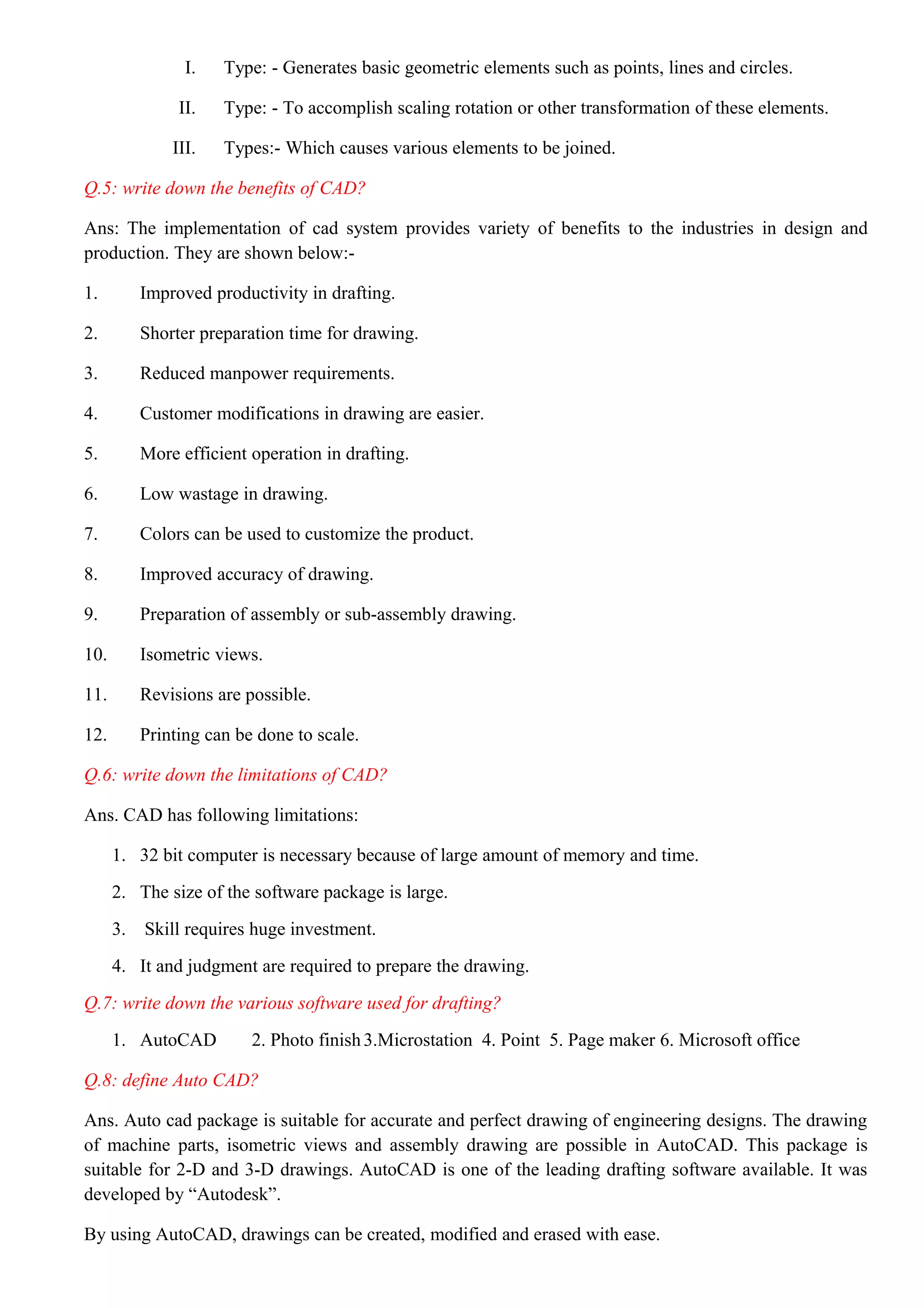 Computer Aided Drafting (CAD) is a digital drawing process used across various engineering fields to improve design accuracy and efficiency. It involves the use of software like AutoCAD, SolidWorks, and others to enhance productivity, facilitate modifications, and manage design data. Benefits include improved productivity, reduced preparation time, and increased accuracy, while challenges such as the need for skilled personnel and large software sizes are notable limitations.