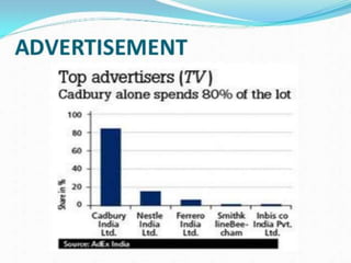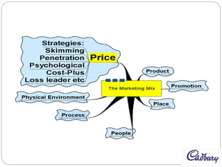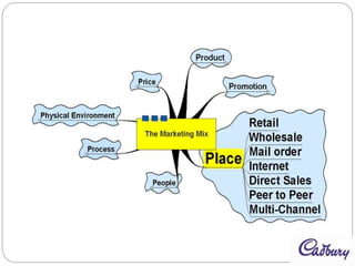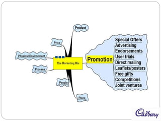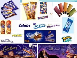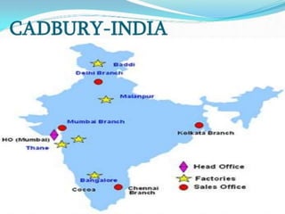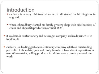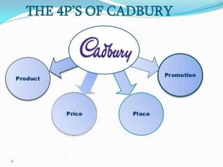 Cadbury is a British confectionery company founded in 1824 in Birmingham, England. It has direct operations in over 60 countries and sells products in almost every country worldwide. In India, Cadbury began operations in 1948 by importing chocolates. It uses the marketing mix of product, price, place, and promotion to market its brands such as Dairy Milk, 5Star, Perk, and Celebrations. It promotes its products through television, print media, posters, sponsorships, and celebrity endorsements.