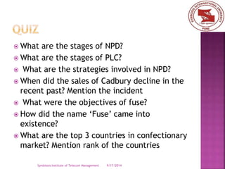 The document discusses Cadbury's confectionary products and market in India. It provides details on the stages of cocoa harvesting and chocolate production. It then discusses Cadbury's best-selling Dairy Milk brand in India, including its introduction, growth, maturity and strategies used over time. It also mentions other Cadbury products introduced in India and their histories. Topics covered include the objectives of Fuse's development, its successful launch and marketing strategies used.