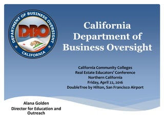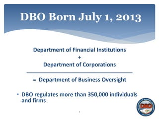 The California Department of Business Oversight (DBO) regulates a variety of financial institutions and oversees licensing under the California Residential Mortgage Lending Act (CRMLA). Recent updates include the requirement for DBO-licensed lenders to file a 2015 residential mortgage loan report and the availability of online submissions for the CRMLA annual report. The DBO also emphasizes its mortgage education outreach program to support homeownership and inform borrowers of their rights.