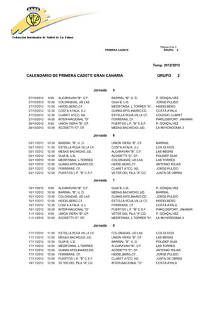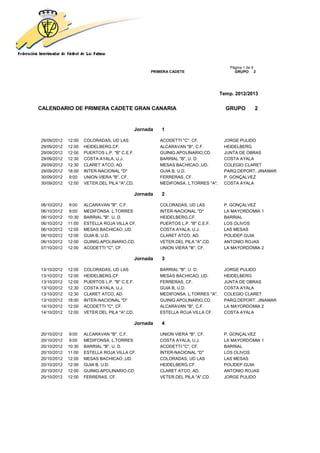 This document contains a calendar for the 2012/2013 season of the Primera Cadete group 2 in Gran Canaria. It lists the match dates and locations for 12 rounds of matches between 14 youth football teams. The matches will take place on Saturdays and Sundays from September 2012 through December 2012 at various football fields in Gran Canaria.