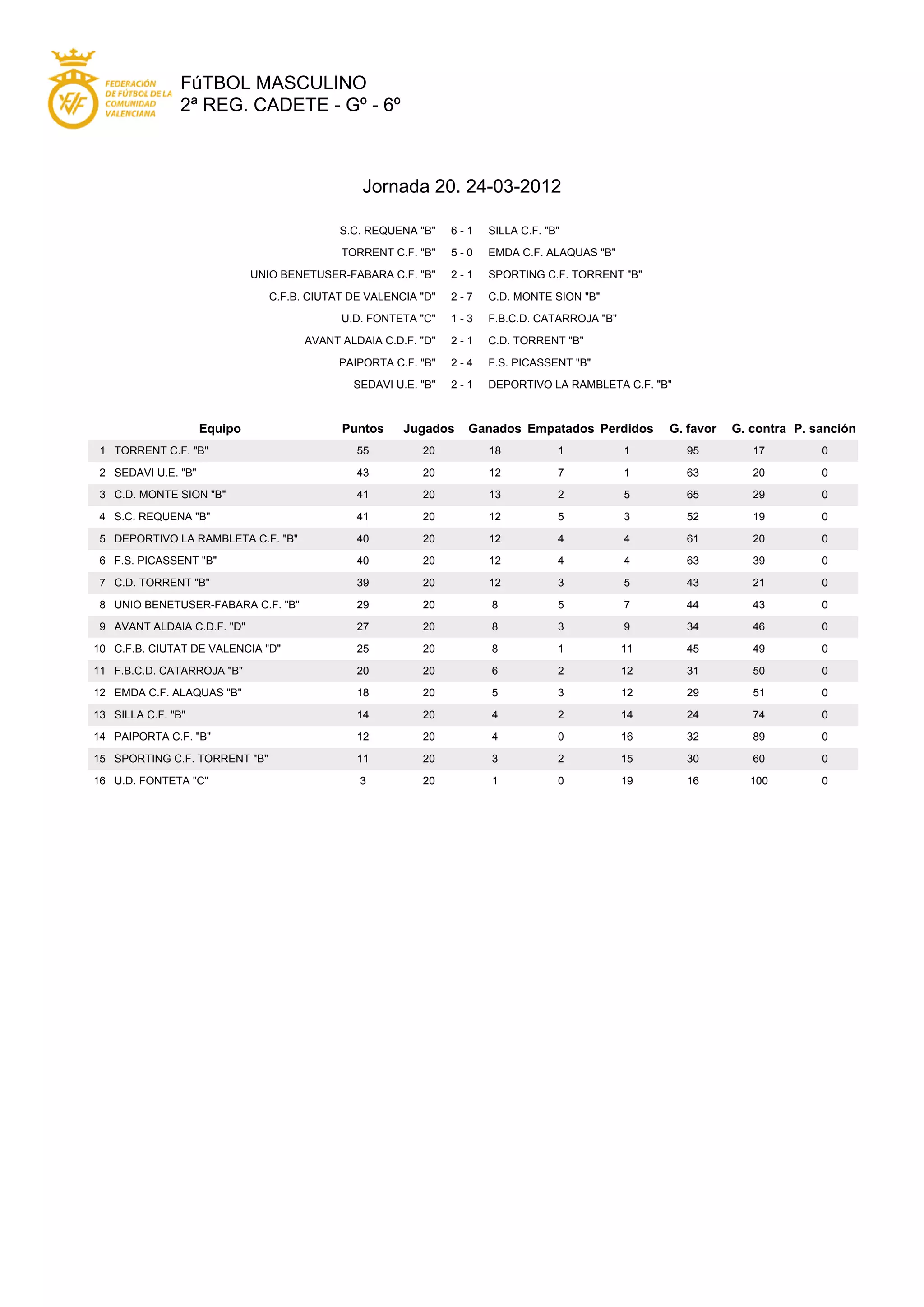 The document summarizes results from the 20th matchday of the 2nd Regional Cadet league in Go. Torrent C.F. "B" defeated EMDA C.F. Alaquas "B" 5-0. Union Benetuser-Fabara C.F. "B" defeated Sporting C.F. Torrent "B" 2-1. C.D. Monte Sion "B" defeated C.F.B. Ciutat de Valencia "D" 7-2. The standings table shows Torrent C.F. "B" in first place with 55 points followed by Sedavi U.E. "B" in second with 43 points and C