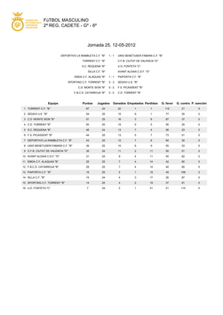 This document summarizes the results of the 25th matchday of the 2nd Regional Cadet league in Spain. It lists the matches played and their results. It also includes a table showing the current league standings, with Torrent C.F. "B" in first place with 67 points from 24 games.