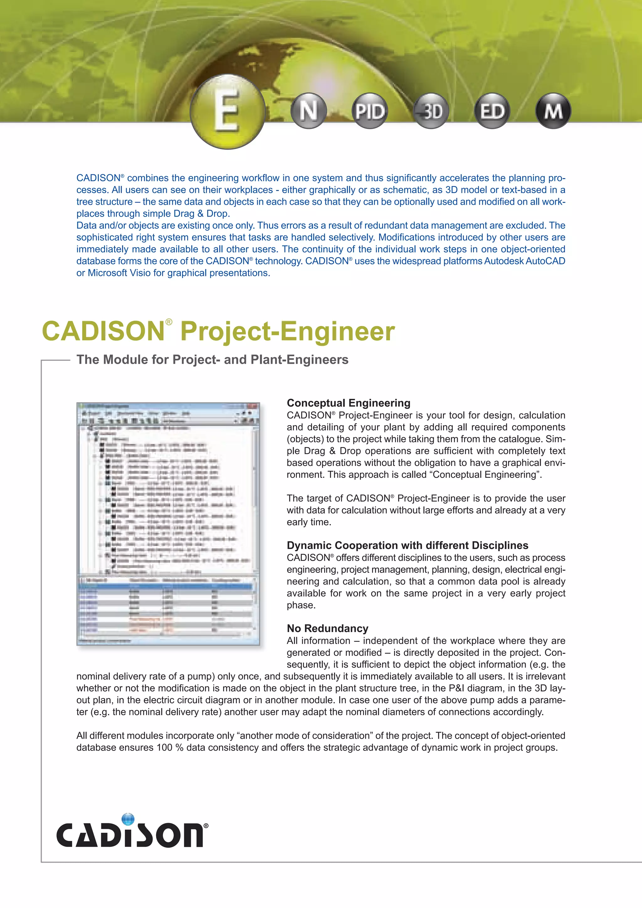 Cadison® Project-Engineer is a comprehensive tool designed for project and plant engineers, facilitating the design, calculation, and detailing of plants through an object-oriented database. The system allows for dynamic cooperation among different disciplines, ensuring data consistency and eliminating redundancy by allowing modifications to be immediately accessible across various modules. Key features include integrated project management, cost calculation, and a report generator, all aimed at increasing efficiency and collaboration in engineering projects.