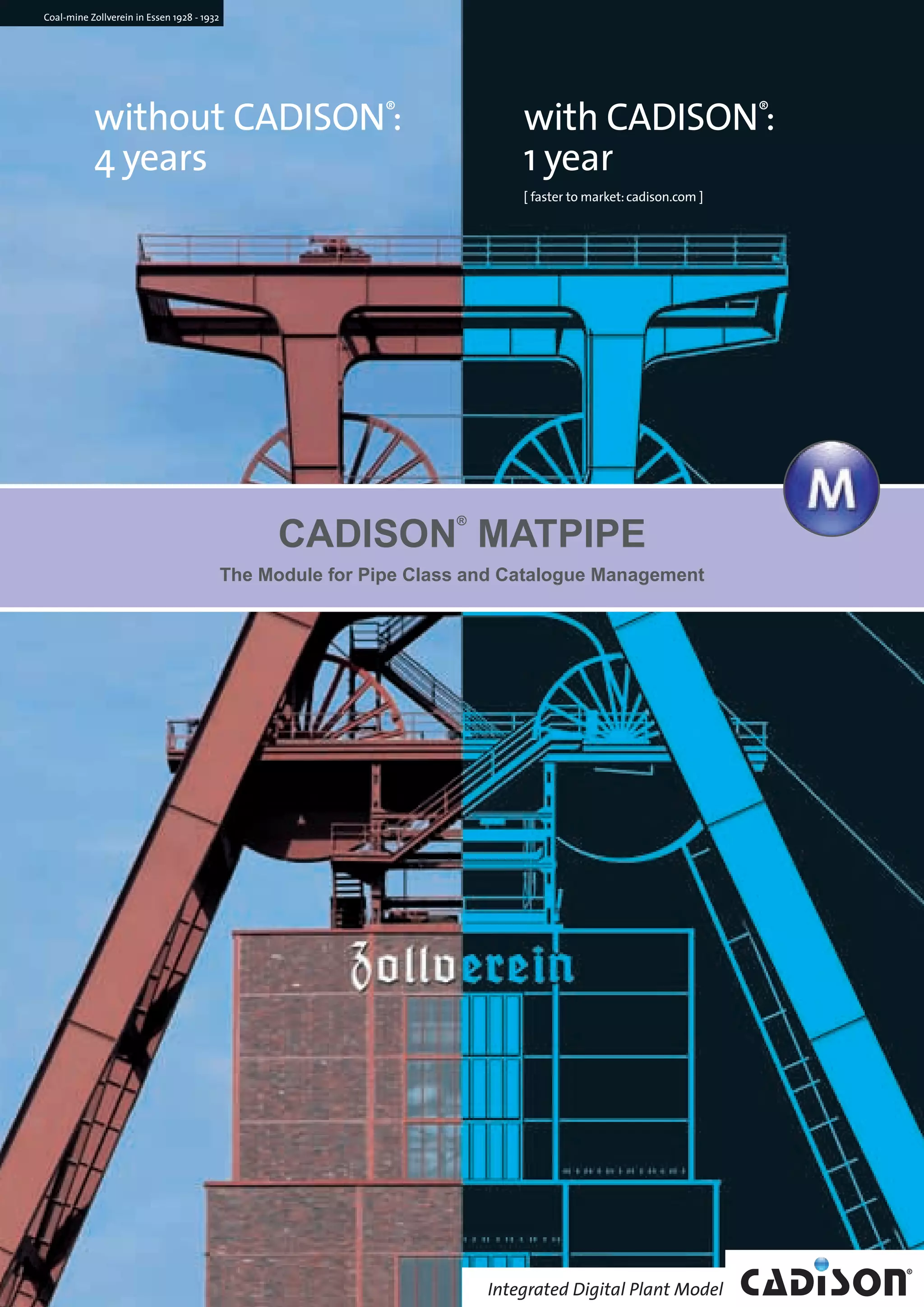 CADISON® MATPIPE is a central pipe class and catalogue management system that allows users to manage pipe classes and manufacturer catalogues for industrial plant planning projects. It helps standardize component selection and allows all project parties to access pipe class and catalogue data. CADISON® combines engineering workflows and data in one system, significantly accelerating planning processes by ensuring everyone works from the same current data.
