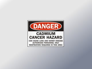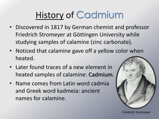 Friedrich Stromeyer discovered cadmium in 1817 while studying calamine. Cadmium is a soft, silvery-white metal that occurs naturally as a byproduct of zinc mining. It has many industrial uses, including in nickel-cadmium batteries, solar panels, and nuclear reactors. Cadmium is toxic to humans and environmental exposure can occur through cigarette smoke, coal burning, contaminated food/water, and landfill runoff.