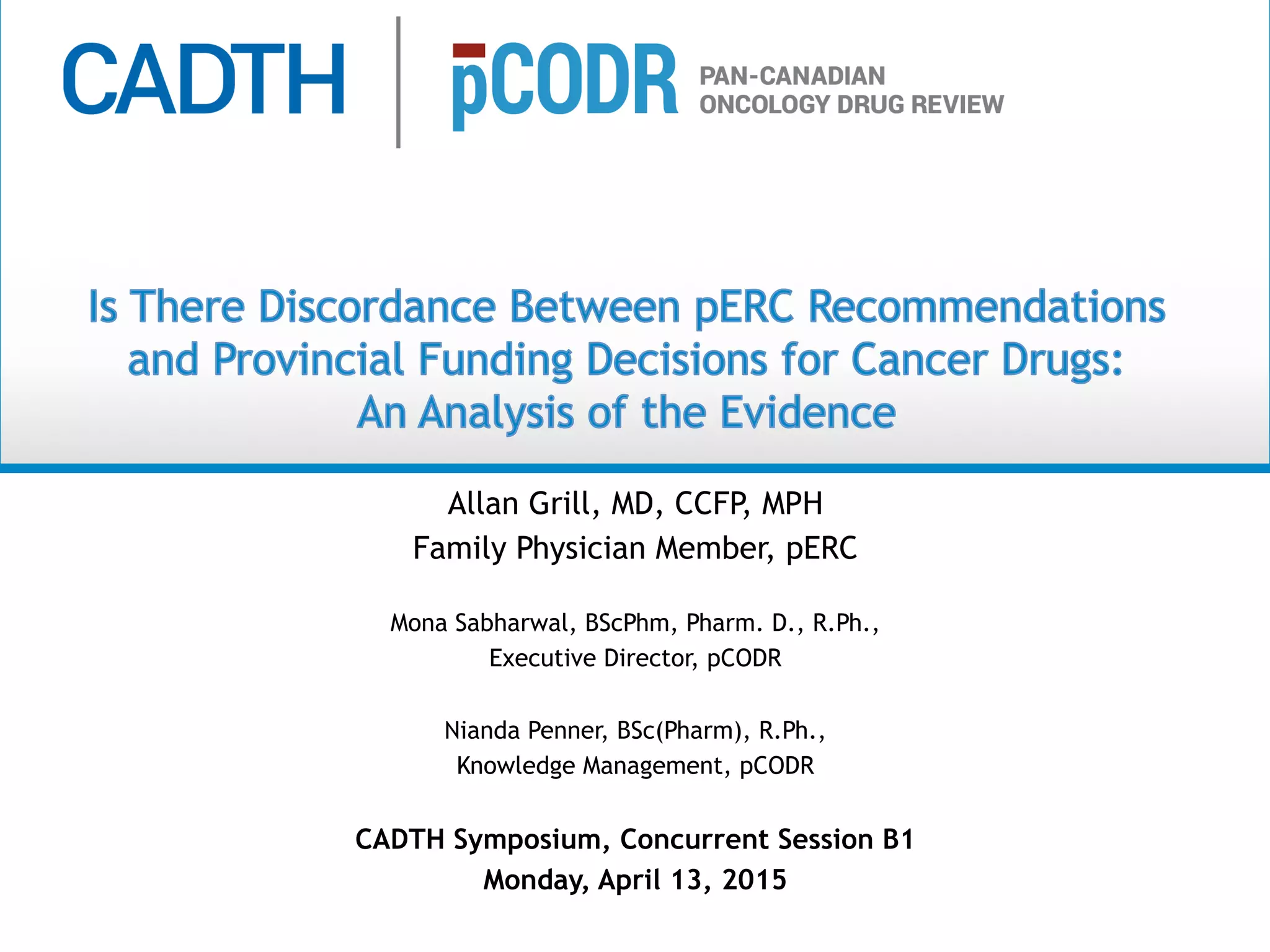 The document discusses discordance between recommendations from the pan-Canadian Oncology Drug Review (pERC) and provincial funding decisions for cancer drugs in Canada. It presents results from a survey of provincial drug funding decision-makers that identified several potential reasons for discordance, including differences in priorities, clinical evidence, and budget constraints between the levels. Challenges to alignment included issues with clinical trial evidence as well as pressure to expand access, while suggested solutions centered on strengthening consensus around treatment pathways and priorities nationally.