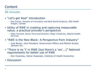 This document discusses a panel on the evolving role of real-world evidence to support healthcare policy and practice. It provides an introduction to real-world evidence and its increasing importance. The panel will discuss current and future trends in the use of real-world data from electronic health records to conduct healthcare assessments and support decision making. This includes issues around frameworks for using real-world evidence, aligning with patient and policy priorities, and overcoming technical challenges. The discussion will also involve perspectives from healthcare, industry, and research on preparing for the growing role of real-world evidence.