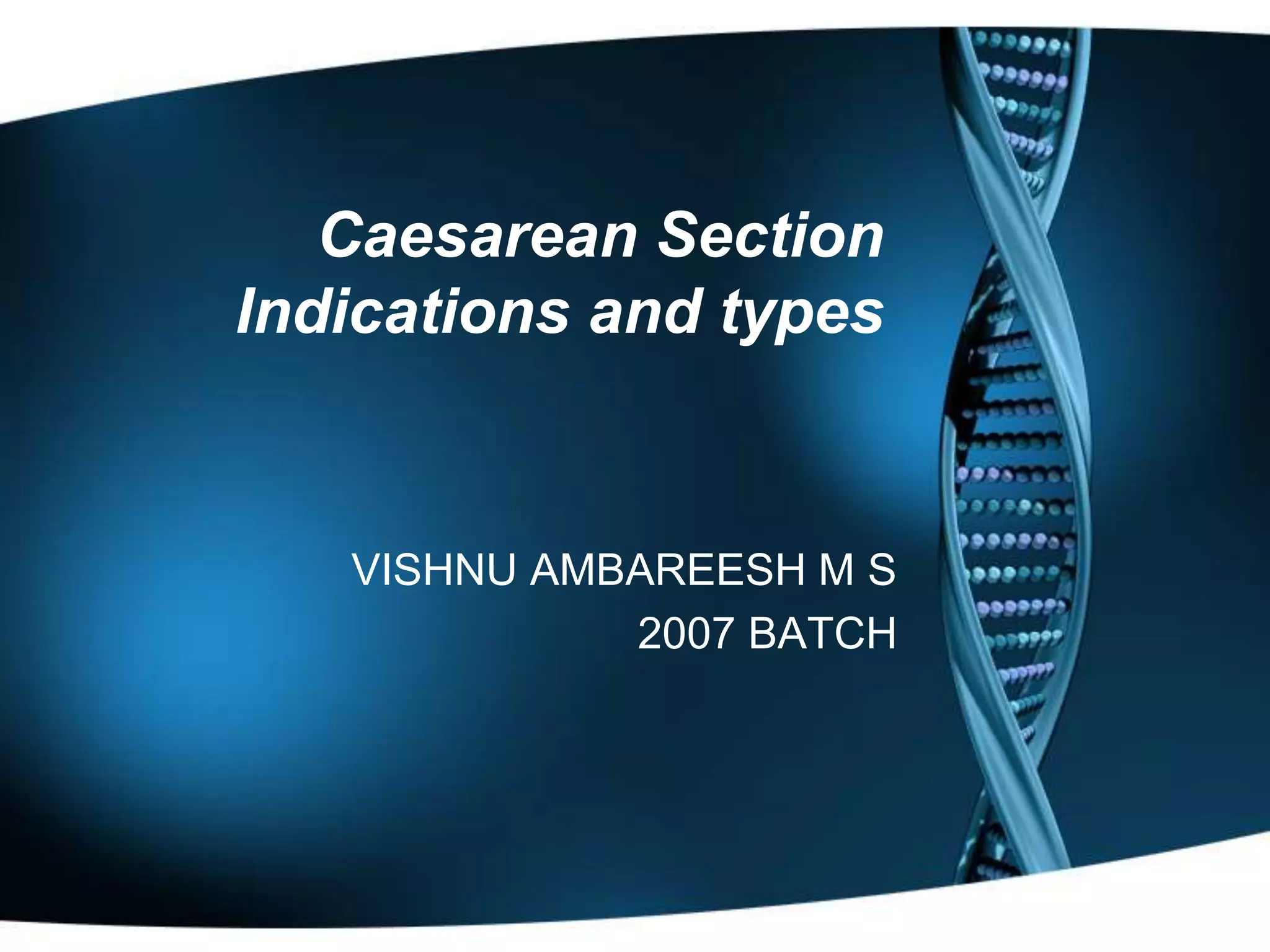 Caesarean section is the removal of a child through an incision in the abdominal wall of an intact uterus. The incidence of caesarean sections has increased worldwide in the last 25 years, mainly due to repeat caesareans, dystocia, and fetal distress. Indications for caesarean section include maternal factors like previous c-sections, fetal distress, and fetal-maternal factors. The most common type is a lower segment caesarean section (LSCS) which involves a transverse incision in the lower uterine segment. While caesarean section can be life-saving, it carries more risks than a planned vaginal delivery.
