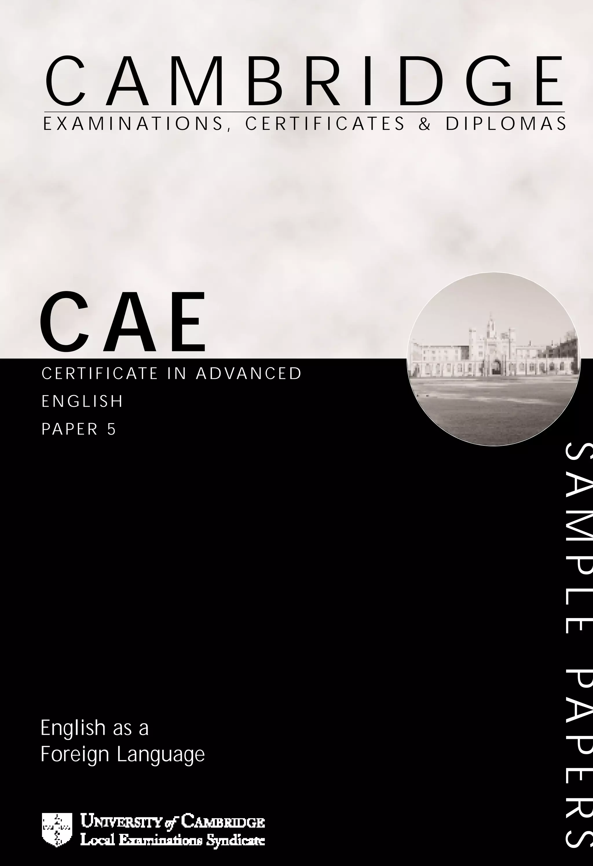 The document provides a sample speaking test for the Cambridge Certificate in Advanced English. It consists of 4 parts that require candidates to discuss topics like protective clothing, cartoons depicting a day by the sea, developments in the 20th century, and how the world may change in the future. The test is administered by an interlocutor who asks questions to stimulate conversation between the candidates and evaluates their responses.