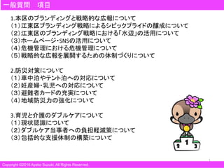 江東区議会 平成28年第4回定例会で鈴木あやこが行った一般質問報告です。 質問だけでなく、これまでの区の政策、国・都・先進自治体の動向などを盛り込み、議会質問の報告をしております。 平成28年12月21日の「あやこcafe」の資料です。