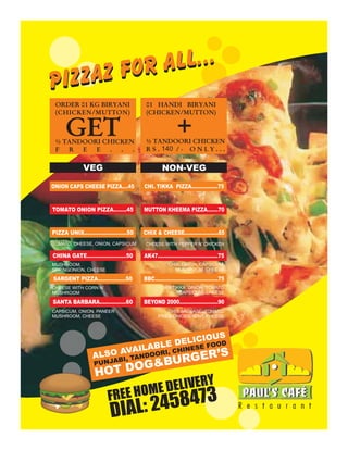 This document contains menus for Chinese, cafe, Indian and tandoor dishes. It lists various soups, vegetable and non-vegetarian dishes with their prices. The menus include items like fried rice, noodles, burgers, milkshakes, tea and pizza. Contact information is provided at the bottom for home delivery from Dream House restaurant in Nashik, India.