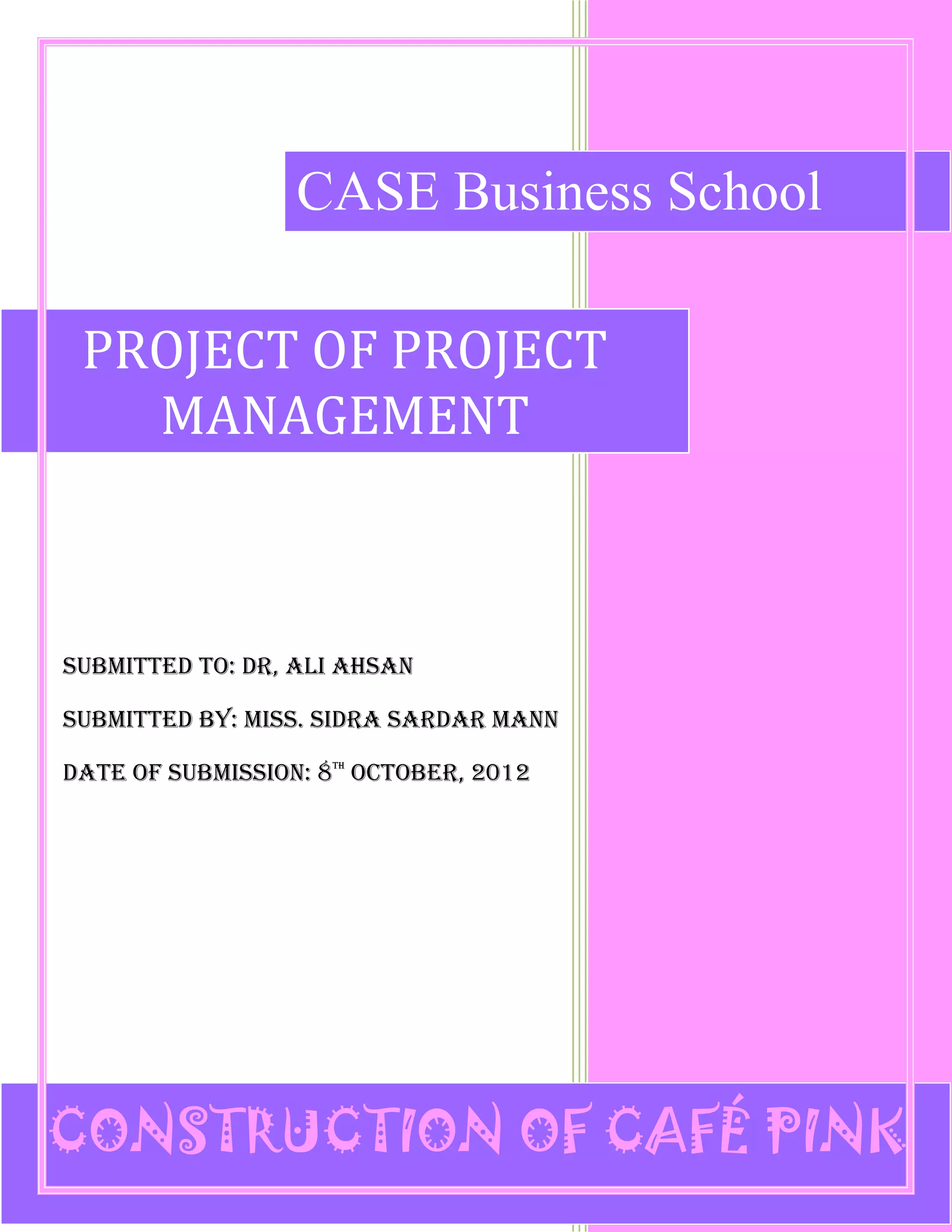 The document summarizes the initiation phase of a project to construct Café Pink in Islamabad, Pakistan. The project aims to provide a safe environment exclusively for women. The initiation phase involves developing a project charter that outlines the objective to construct the café within 6 months for Rs. 10 lac. Key stakeholders are identified, including the project supervisor, sponsors, customers, and a contractor. Roles and responsibilities are defined.