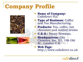 Cafédirect PLC is a coffee and tea manufacturing company based in London, UK that focuses on fair trade. It works with over 250,000 smallholder farmers in 11 countries. Cafédirect's mission is to strengthen the income and livelihoods of producer partners in developing countries through fair pricing and direct trade. The company offers a range of coffee, tea, and drinking chocolate products. It has experienced steady growth in recent years through marketing investments and quality improvements with farmers.