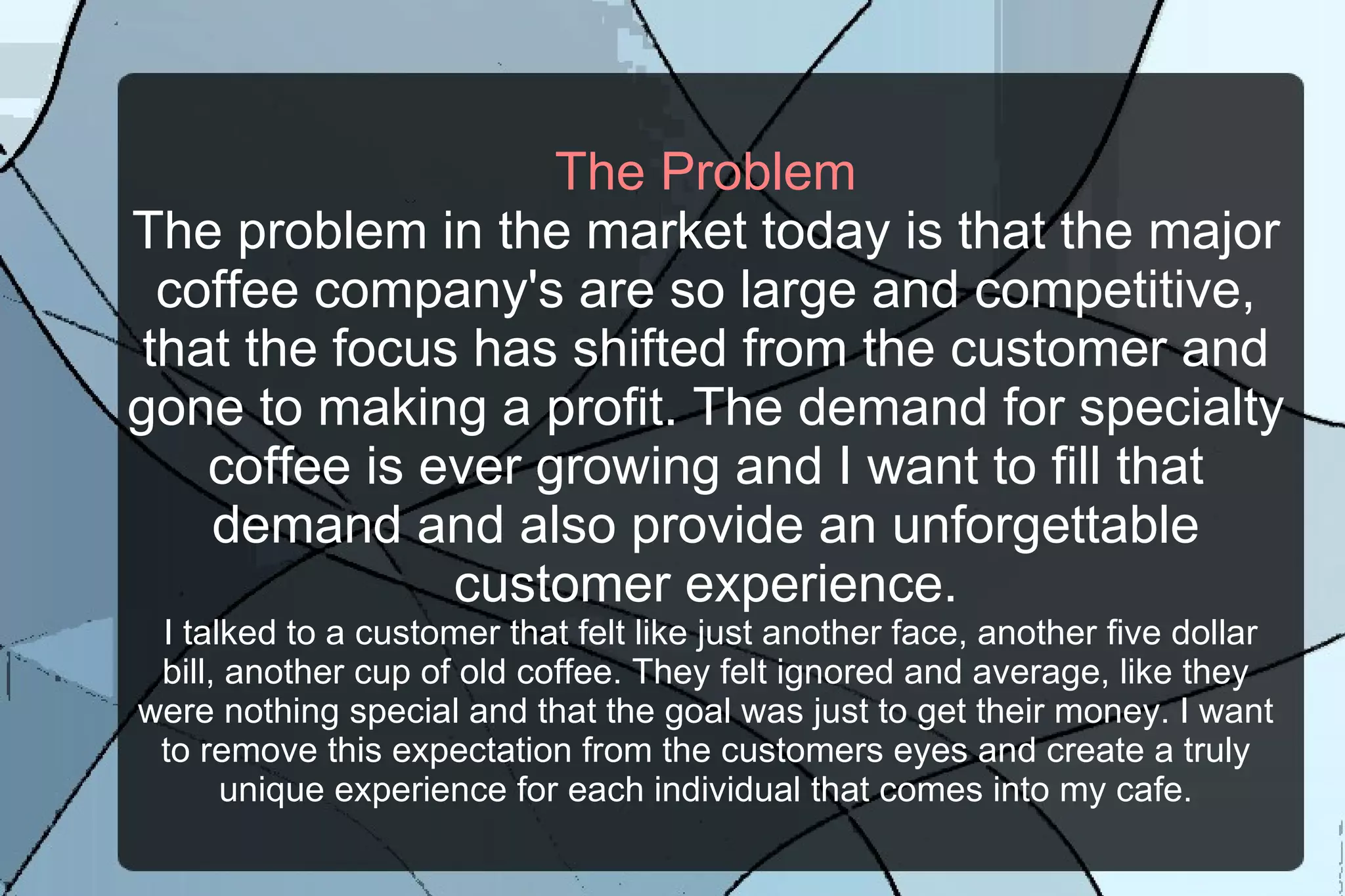The author wants to open a specialty coffee shop to fill the growing demand and provide an unforgettable customer experience, unlike large coffee chains that prioritize profits over customers. The Pink Patio cafe will offer excellent customer service, coffee, and appreciation for life's simple joys. It will target adults who drink coffee daily but want a friendly atmosphere over mass chains. Sales projections and financial plans show the cafe will be profitable within three years.