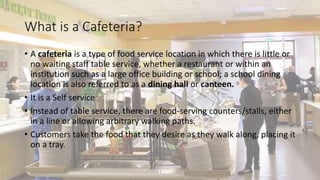 A cafeteria is a self-service food service location found in institutions like offices and schools. Customers select food from various food stalls or counters and pay at the end of the line. Cafeterias are mainly classified as traditional or free-flow. In a traditional cafeteria, customers move down a straight line of counters selecting food. In a free-flow cafeteria, counters are arranged in various layouts allowing customers to choose which station to visit first to select their food.