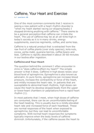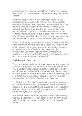 Caffeine can affect the heart by raising levels of epinephrine, which increases blood pressure, heart contractility, and heart rate. In high doses, caffeine can cause abnormal heart rhythms or palpitations in susceptible individuals. However, for most people caffeine's effects on the heart lessen with regular use as tolerance develops. Moderate caffeine intake through sources like coffee in amounts around 3-6 mg per kg of body weight has been shown to improve exercise performance and endurance without harmful effects. Those with heart conditions should consult a doctor before using caffeine for exercise.