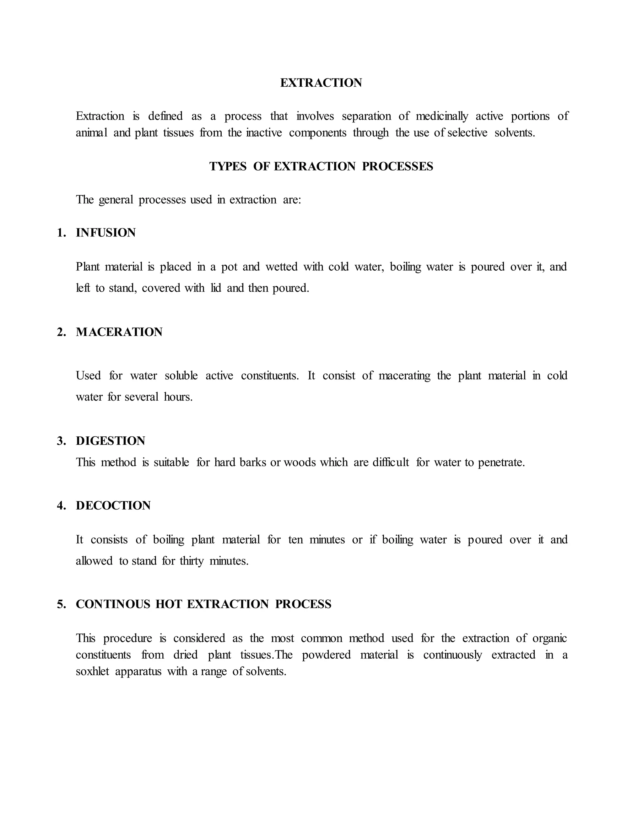Extraction is defined as a process that involves separating active plant or animal components from inactive ones using selective solvents. There are several extraction processes, including infusion, maceration, digestion, decoction, continuous hot extraction, solvent-solvent precipitation, and liquid-liquid extraction. Caffeine is extracted from coffee seeds through infusion by steeping the seeds in water. It is then isolated from the tea solution through liquid-liquid extraction using methylene chloride followed by evaporation of the solvent to yield caffeine.