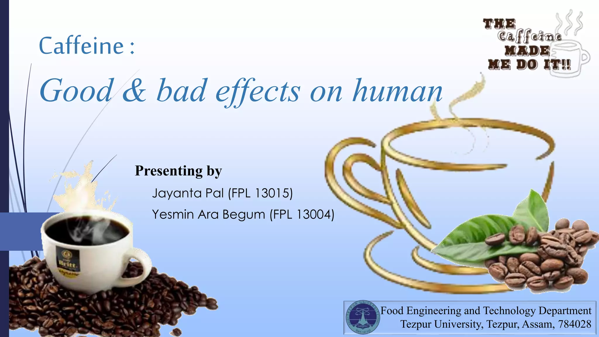 This document discusses caffeine, including its history, sources, mechanism of action, metabolism, extraction processes, health benefits, risks, and decaffeination. Caffeine is a natural stimulant found in coffee, tea, soft drinks and energy drinks. It acts as an antagonist to adenosine receptors in the brain, increasing neuronal activity. While caffeine has potential benefits like reducing Alzheimer's risk, it can also increase heart rate and blood pressure. The document examines studies on both the positive and negative health effects of caffeine consumption.