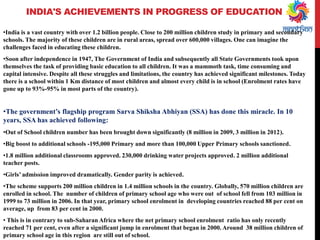 The document discusses issues and achievements in primary education in India. It outlines how government programs like Sarva Shiksha Abhiyan have increased enrollment but quality remains a problem. Learning assessments show many students lack basic skills. Challenges include teacher shortages, untrained teachers, and high dropout rates. More funding is needed to achieve goals like universal primary education.