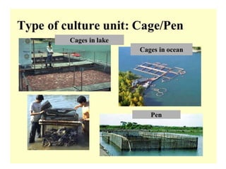 Cage culture involves raising fish in mesh boxes placed in bodies of water. It originated in Cambodia about 200 years ago when cages were used to transport live fish to market. Cages are constructed with frames made of wood, plastic or steel, with floats to keep them buoyant and weights to anchor them. They come in various shapes and sizes, usually square or rectangular, and are 20-60 cubic meters. Cages are either fixed in flowing water, floating in lakes/rivers/offshore, or submerged and movable in areas prone to cyclones. Fish are fed through natural water movement and supplemental feeding of rice bran, fish meal and soybean cake. Fish production ranges from 3,000-25,000 kg