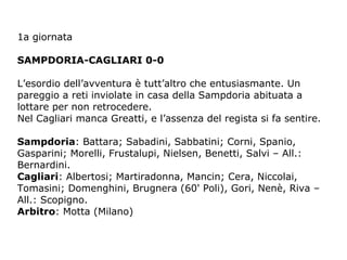 Il documento riporta i risultati delle prime tre giornate di campionato del Cagliari, con un pareggio iniziale contro la Sampdoria e due vittorie successive contro il Vicenza e il Brescia. La coppia Domenghini-Riva si distingue per il loro contributo decisivo nelle vittorie, segnando entrambi i gol nella partita contro il Brescia. Nonostante l'assenza di Greatti, il Cagliari mostra segni di crescita nel corso delle partite.
