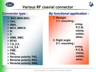 This document provides information on Century Associates' coaxial connectors and adapters. It lists various connector types including BNC, TNC, SMA, MCX, MMCX, N, F, SMB and others. For each type, it shows straight and right angle connectors with different mounting options. It also lists specifications for impedance, frequency range, voltage ratings, VSWR and contact resistance. The document provides an overview of Century Associates' product offering of RF coaxial connectors, adapters and cable assemblies.