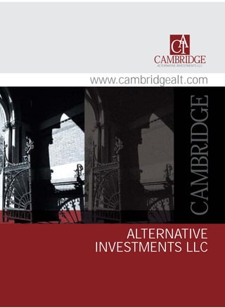Cambridge Alternative Investments is a private equity portfolio advisor and fund of funds manager. They develop investment policies, identify top managers, and dynamically manage risk. They take a quantitative analytical approach to alternative asset allocation, manager selection, and portfolio optimization. Their goal is to bring elements of public markets investing discipline to private equity and provide institutional investors flexible programs and access to top managers.