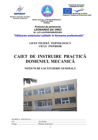 Caietul de instruire practică pentru elevii de clasa a IX-a în domeniul mecanicii are ca scop sprijinirea acestora prin demonstrații practice și prezentarea sculelor și utilajelor necesare. Accentul este pus pe siguranța muncii și formarea deprinderilor esențiale, aceasta incluzând detalii despre locul de muncă și echipamentele utilizate. Proiectul vizează, de asemenea, conștientizarea pericolelor și utilizarea corectă a echipamentului de protecție pentru a evita accidentele în atelier.