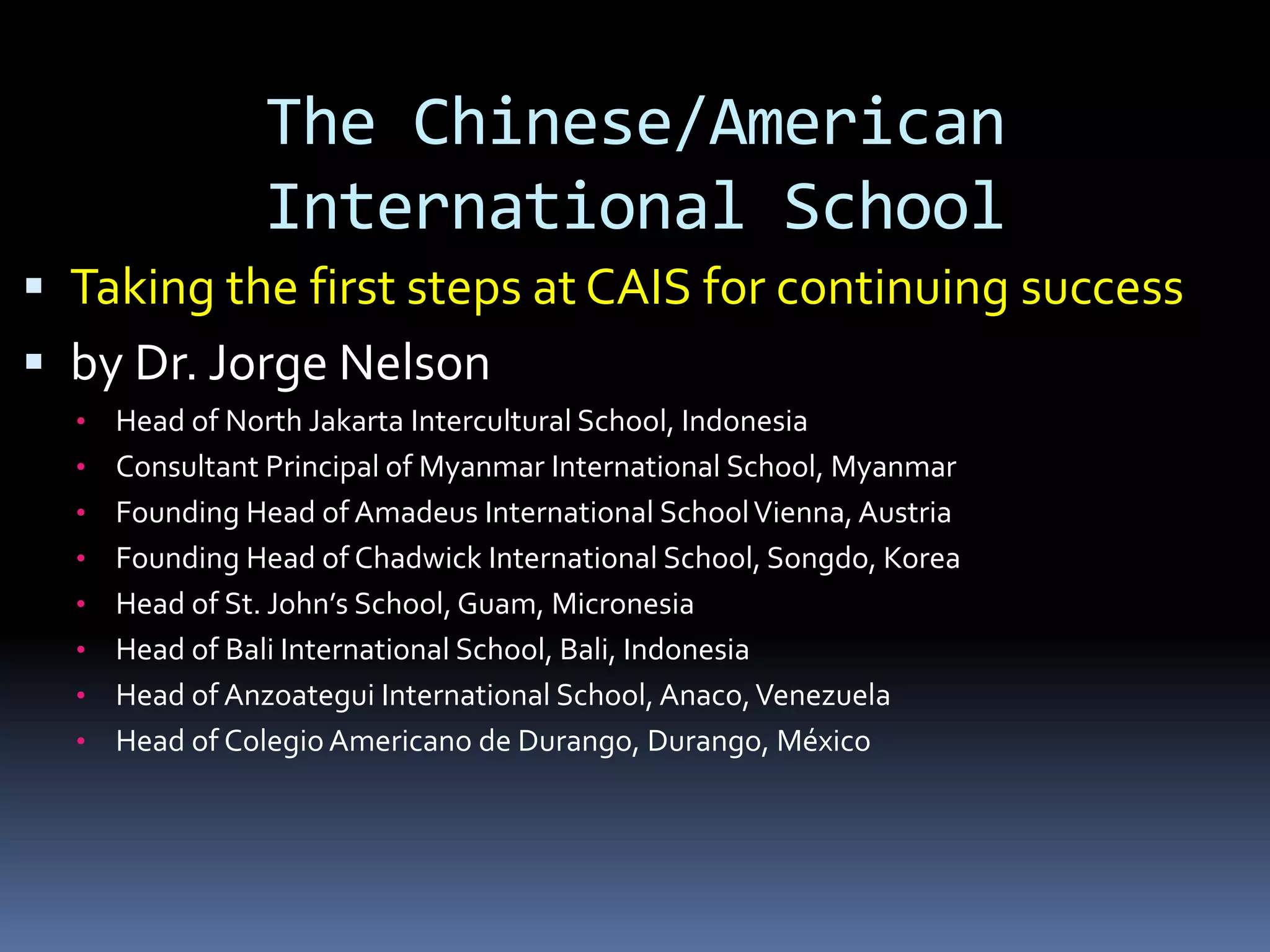 The document discusses the founding head of multiple international schools, Dr. Jorge Nelson, and his experience and principles for continuing success at the Chinese/American International School (CAIS). It outlines Dr. Nelson's 30 years of experience in full immersion international education programs and 10 principles for CAIS, including honesty, respect, collaboration, responsibility, embracing diversity, passion for learning, and supporting a relevant curriculum. It also emphasizes the importance of collaboration within the CAIS community and fundraising to support the school.