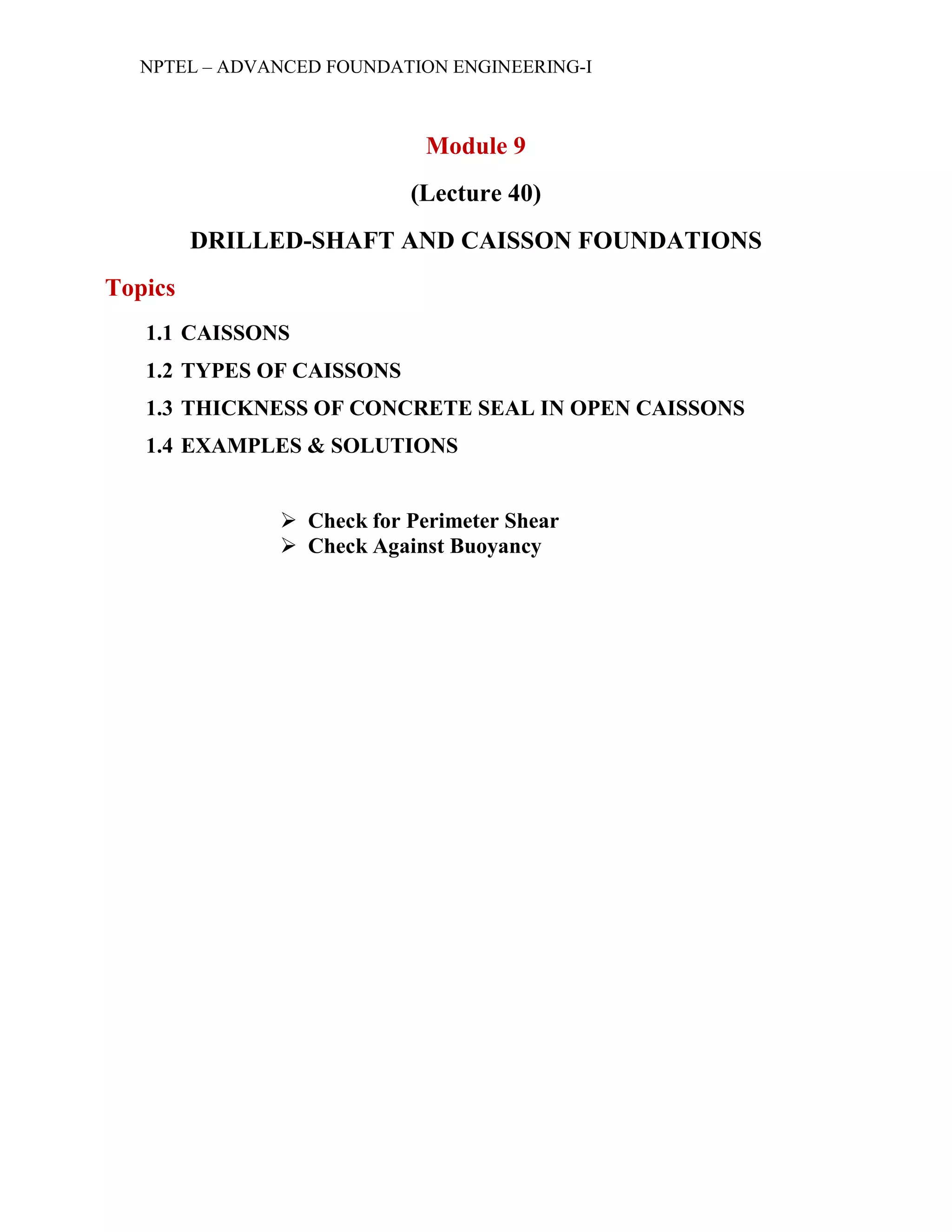 This document discusses different types of caisson foundations, including open caissons, box caissons, and pneumatic caissons. It provides details on how each type is constructed and sunk into place. The thickness of the concrete seal in open caissons is also discussed, with equations provided to calculate the minimum required thickness based on factors like inside radius, unit bearing pressure, and concrete strength. An example problem demonstrates calculating the seal thickness and checking it against perimeter shear and buoyancy requirements for a given open caisson.