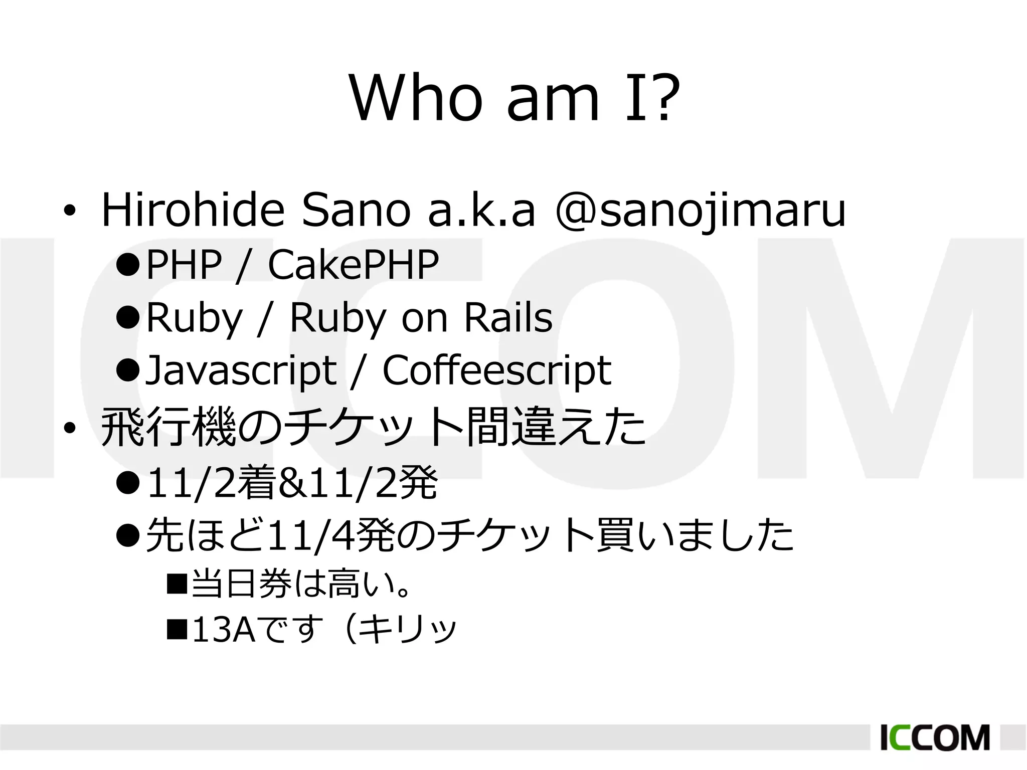 Hirohide Sano a.k.a @sanojimaru l PHP / CakePHP l Ruby / Ruby on Rails l Javascript / Coffeescript • ⾶飛⾏行行機のチケット間違えた l 11/2着&11/2発 l 先ほど11/4発のチケット買いました n 当⽇日券は⾼高い。 n 13Aです(キリッ