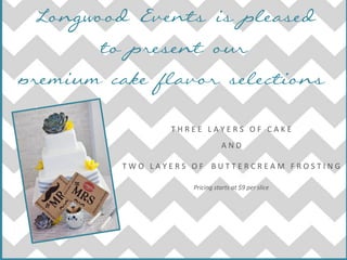 This document describes 14 different cake flavors that are available for $9 per slice. The cakes have 3 layers of cake and 2 layers of buttercream frosting. The flavors include lemon cake with lemon buttercream, cinnamon spice cake with white chocolate buttercream, and dark chocolate cake with chocolate-orange buttercream. Toppings range from fresh berries to chocolate truffles. Cake and frosting combinations use flavors like passionfruit, lime, strawberry, hazelnut, and more. Party packages with the cakes start at $10 to $16.50 per person.