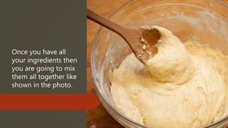 To make a cake, gather all the necessary ingredients like flour, sugar, eggs, and butter. Mix the ingredients together thoroughly as shown in the example photo. Pour the mixed cake batter into a prepared cake pan and bake in the oven.